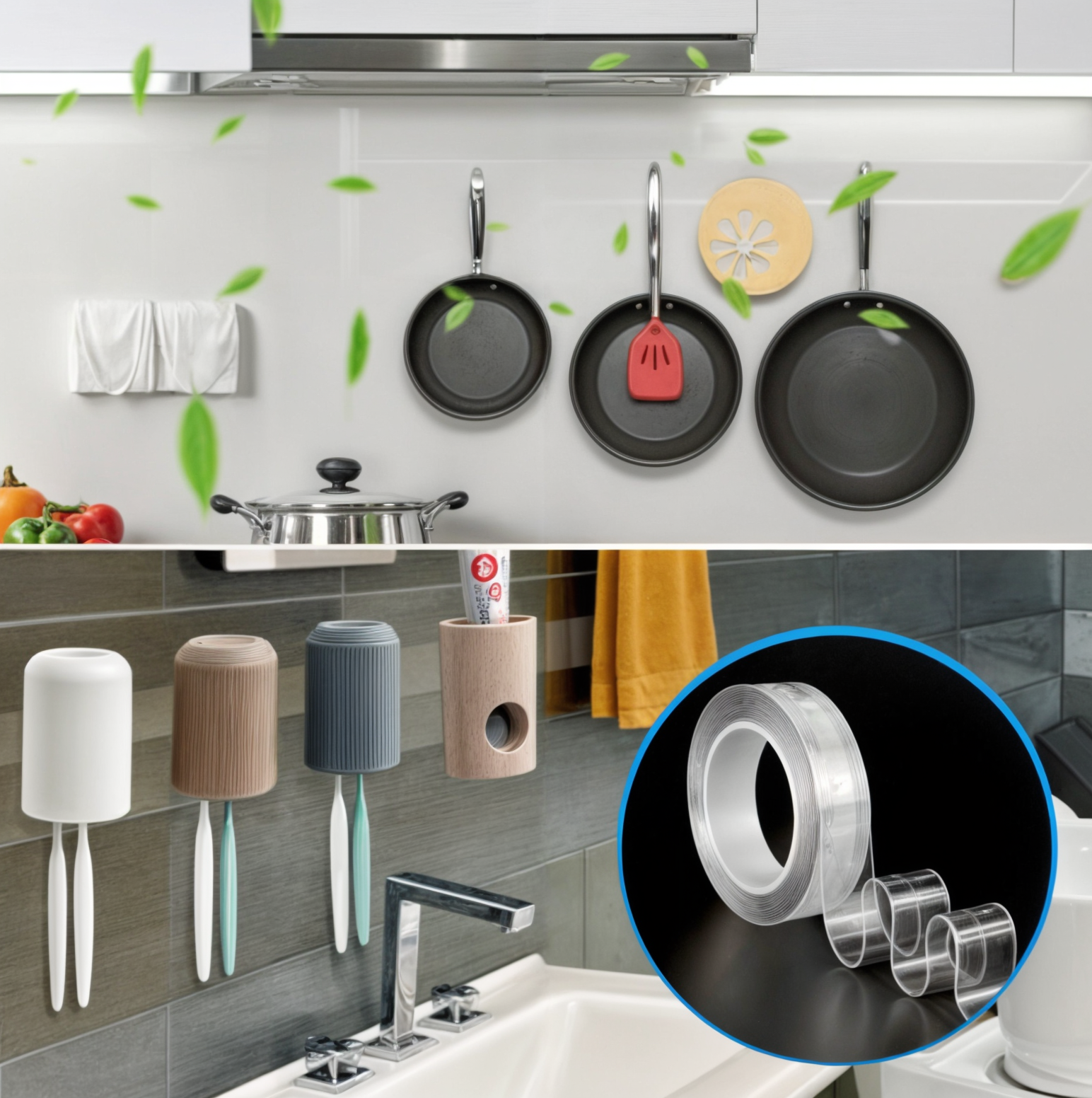 With heavy-duty double-sided adhesive tape, you can secure everything without drilling. Thanks to its ultimate adhesive strength, you can now attach everything in seconds. Want to use the tape somewhere else? It's easy to remove and reuse!